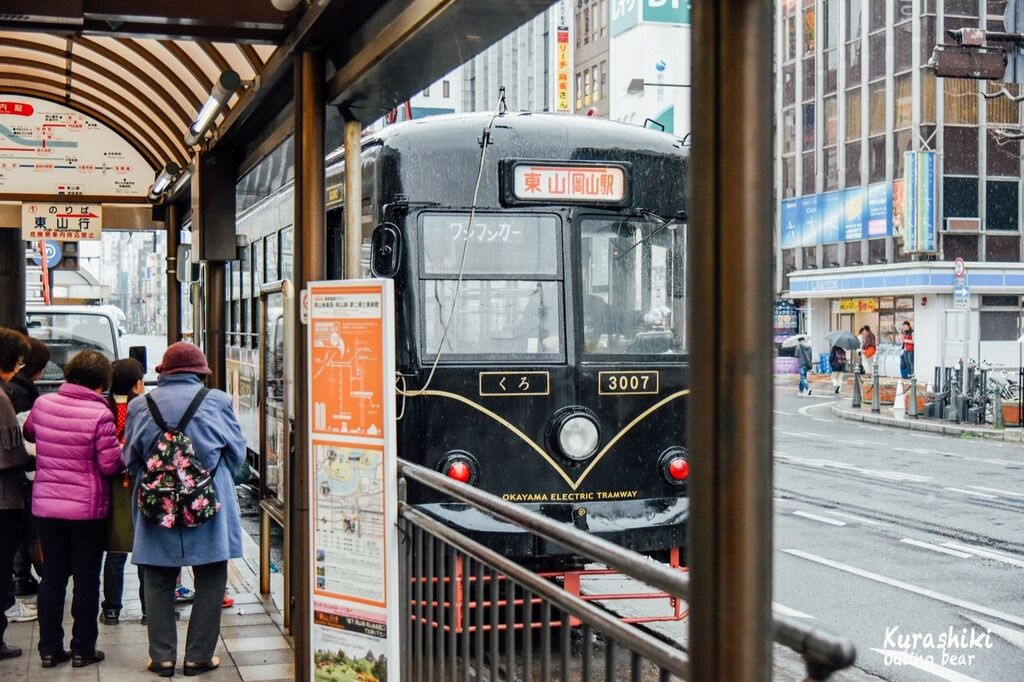 搭乘路面電車前往岡山城,要搭東山線到城下站下車,只要100日幣就夠了